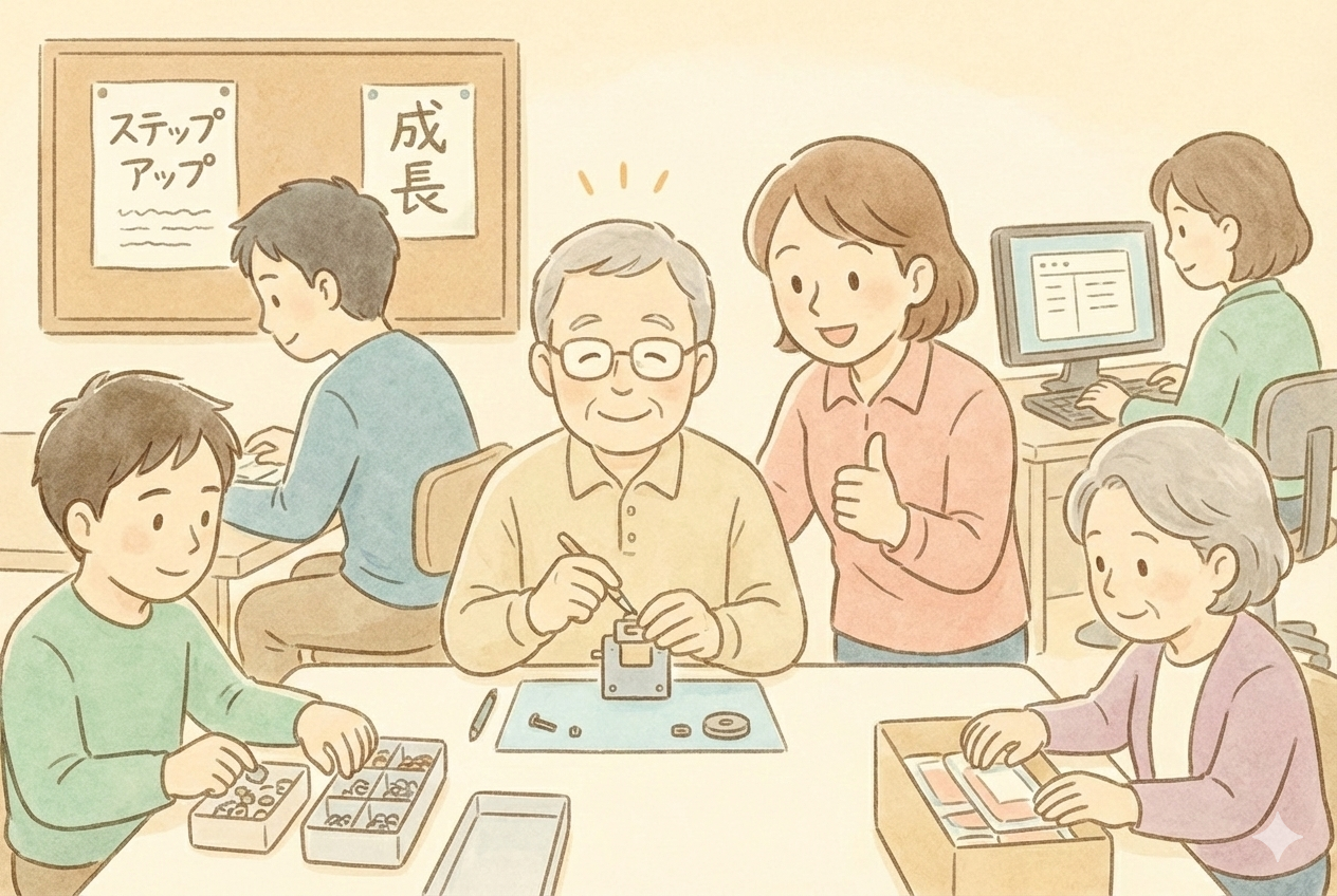 小さな工程から始められたり、体調に合わせて短時間だけ参加できたり──B型事業所は、自分の力を無理なく試しながら進める場です。焦らずに続けることで、気づけば「できる」が少しずつ増えていきます。